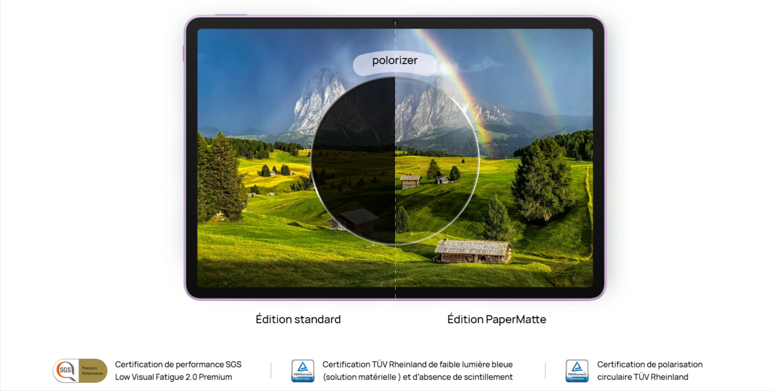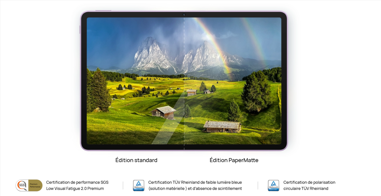 Découvrez tout sous un nouveau jour. L’écran Huawei MatePad à faible lumière bleue prend en charge la gradation CC et le réglage automatique de la luminosité, améliorés par la toute nouvelle technologie de polarisation circulaire. Cette solution matérielle convertit la lumière de l’écran en une lueur douce et naturelle, améliorant le confort visuel tout en maintenant une grande visibilité, même avec des lunettes de soleil.