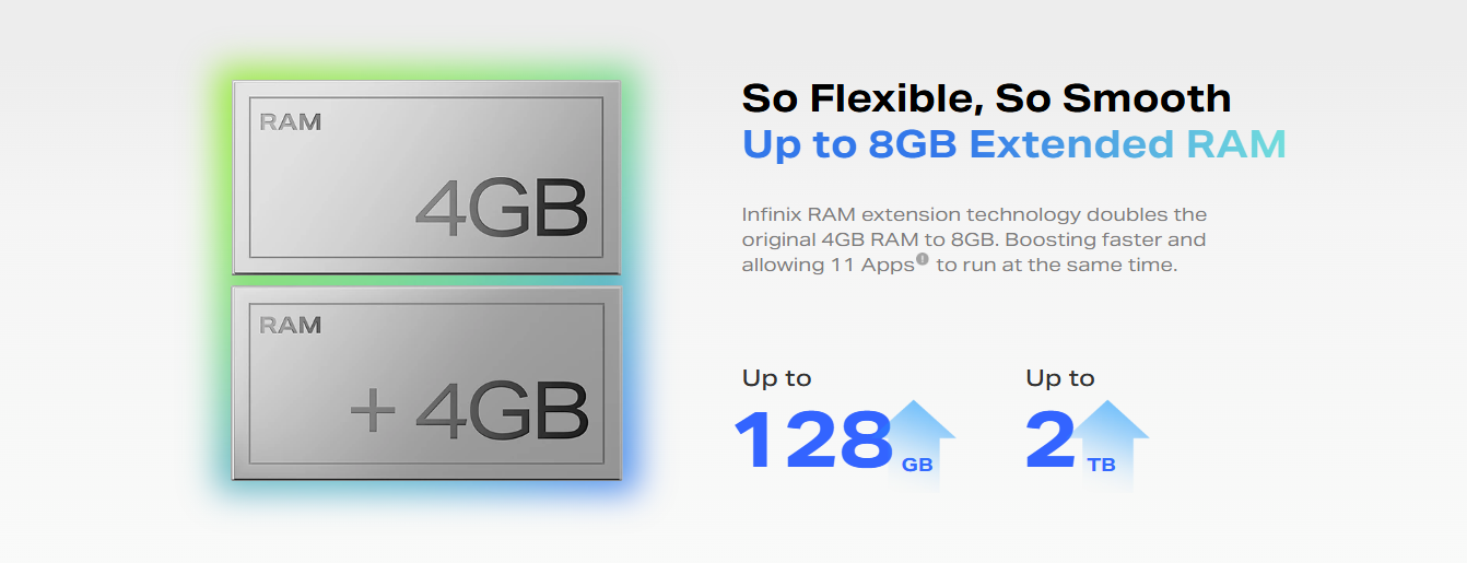 - · Up to 8GB Extended RAM + 128GB Storage