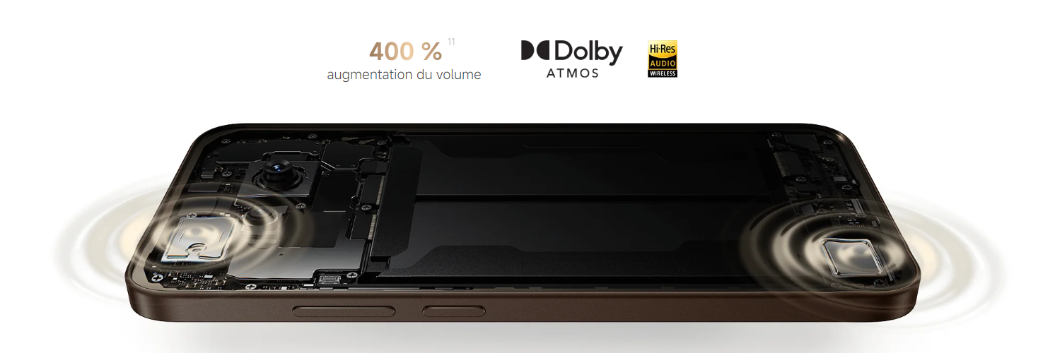 Doté de deux haut-parleurs, offrant jusqu’à 400 % d’augmentation du volume pour une expérience audio explosive et une immersion instantanée.