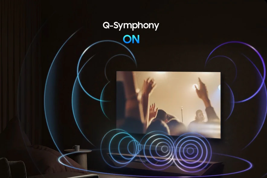 La technologie Q-Symphony synchronise tous les haut-parleurs du téléviseur avec les haut-parleurs de la barre de