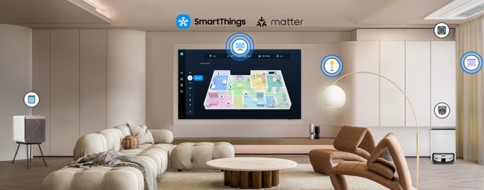 Grâce au Smart Hub intégré, votre téléviseur peut connecter et contrôler des appareils intelligents, même ceux nécessitant une compatibilité Matter et HCA. Vous pouvez également recevoir des notifications de vos appareils directement sur l’écran, y compris une vue plan 3D qui présente l’ensemble de votre système de maison connectée en un coup d’œil.