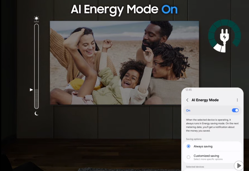 Grâce à SmartThings, économiser de l’énergie est un jeu d’enfant. En activant le mode économie d’énergie avec IA, il détecte automatiquement les niveaux de lumière environnante et analyse les comportements d’utilisation pour ajuster la luminosité. IL analyse également le contenu scène par scène pour ajuster subtilement la luminosité dès que possible, afin de réduire la consommation d’énergie.