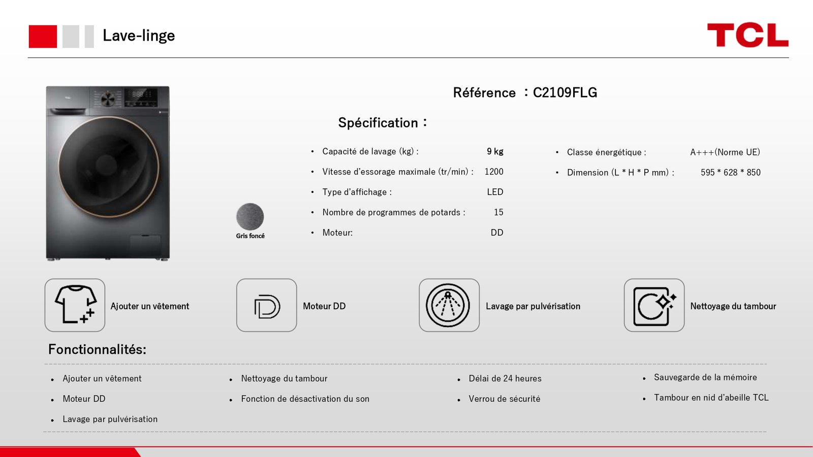 1 avis pour TCL Machine à laver 10kg C2110FLG